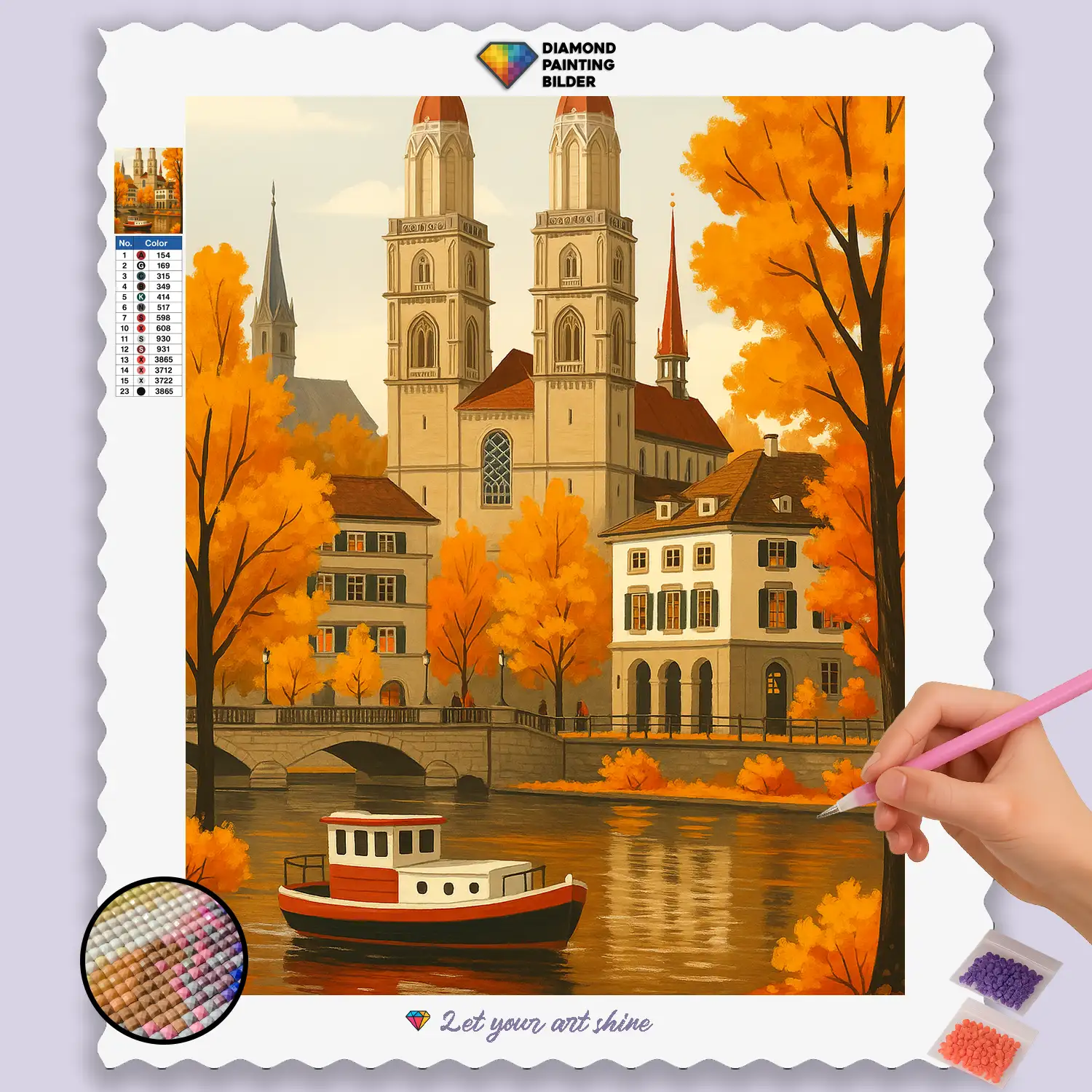Experience the picturesque beauty of Zurich in the golden season with our enchanting Diamond Painting “Autumn Glow at Grossmünster in Zurich”! This atmospheric motif captures the iconic presence of the Grossmünster, surrounded by the warm splendor of autumn colors in Zurich. Imagine the imposing church towers, the golden and red leaves of the trees by the river, and the gentle, inviting atmosphere of a European city in autumn. Each glittering stone helps you bring to life the architectural details of the Grossmünster, the rich colors of the autumnal trees, and the serene, contemplative mood that makes this place so special. It’s a tribute to the beauty of Swiss cities, the grandeur of autumn, and the timeless appeal of a peaceful cityscape. An ideal Diamond Painting for all who love to travel and wish to bring a touch of European charm and autumnal coziness into their home.