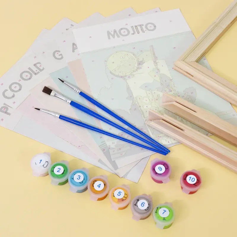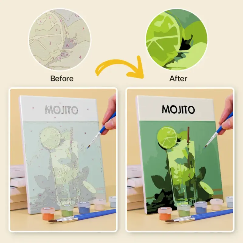 Bring the refreshing feeling of summer to your canvas with the “Summer Mocktails” Mini Paint by Numbers set. The colorful drinks with fruits and ice exude lightness and joy – perfect for a little creative time out. This handy set is ideal for beginners, children, or as a cheerful DIY gift. Included are a pre-printed mini canvas, matching acrylic paints, and fine brushes. Simply relax, paint, and feel the summer.